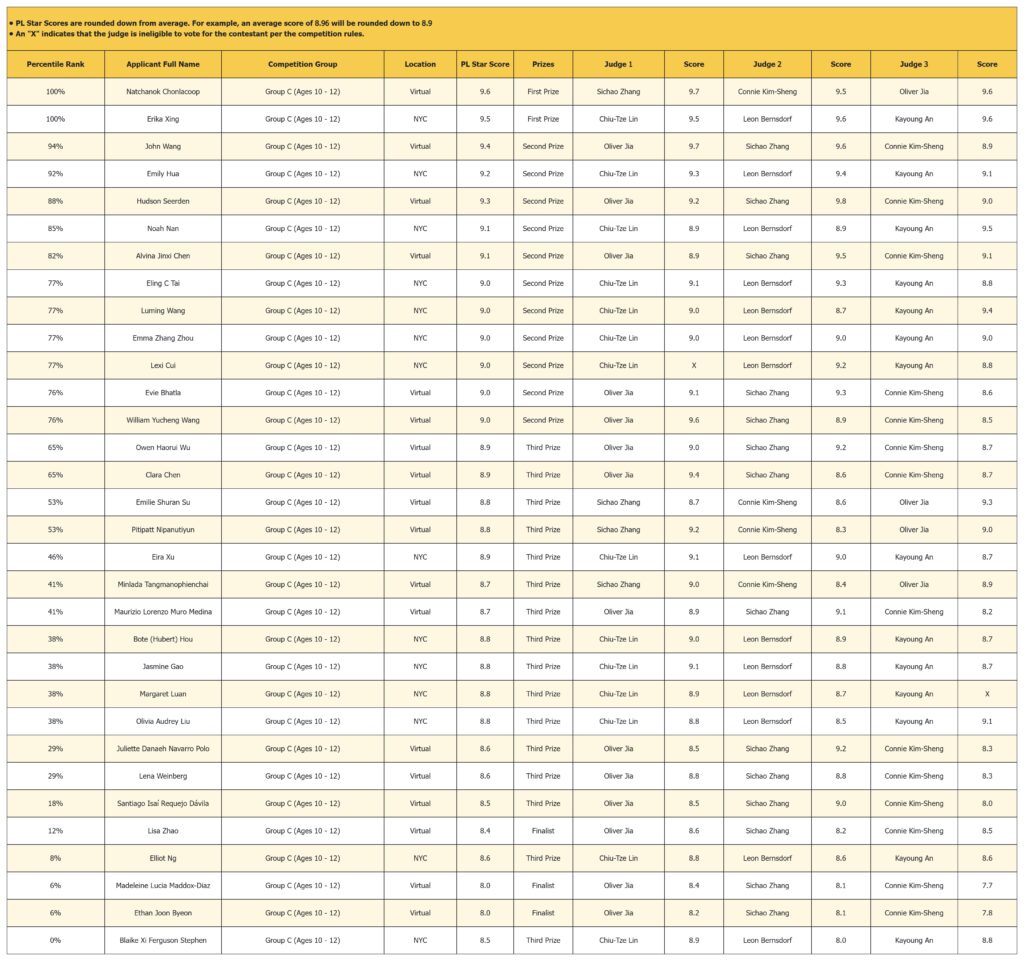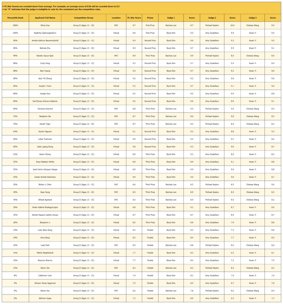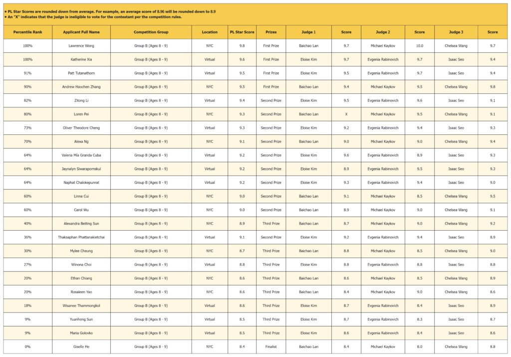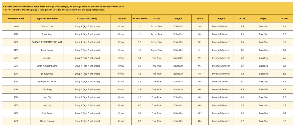The PL Star Score provides a consistent and transparent way to display results by rounding each contestant’s average score down to one decimal place (for example, 9.16 becomes 9.1). Doing so removes unnecessary precision and avoids overly fine distinctions between very similar performances.